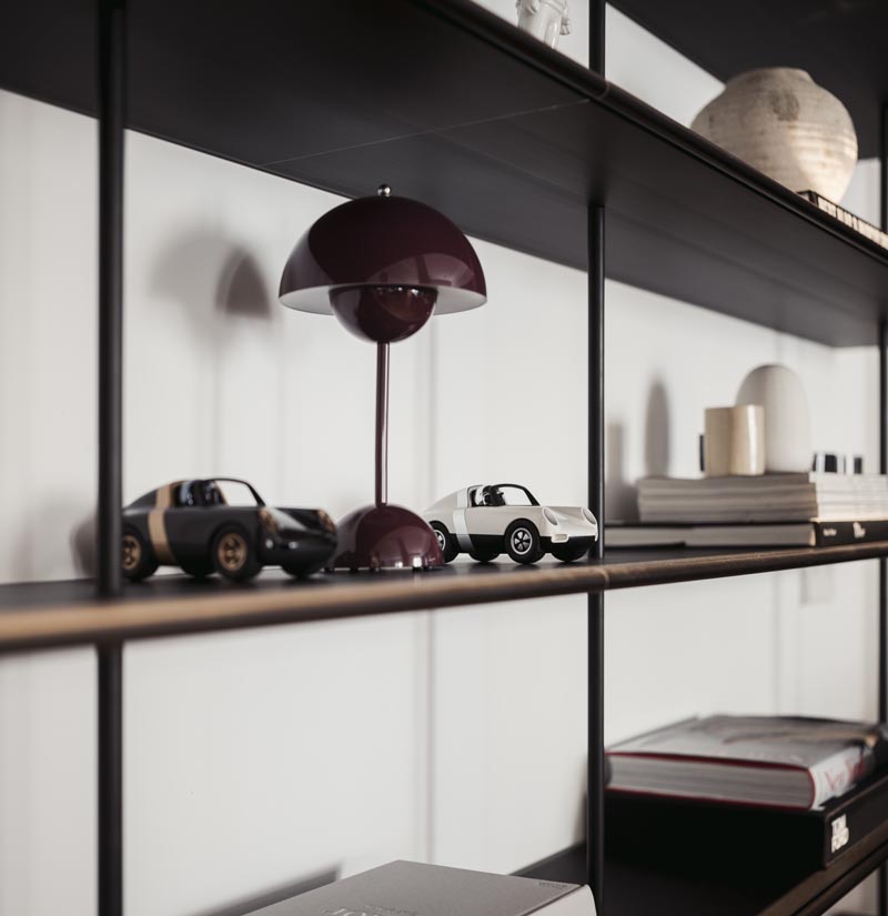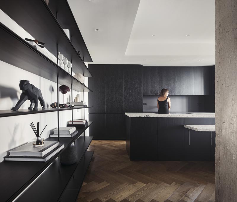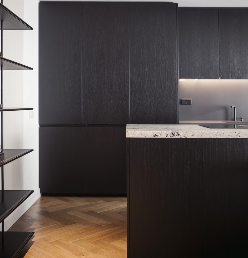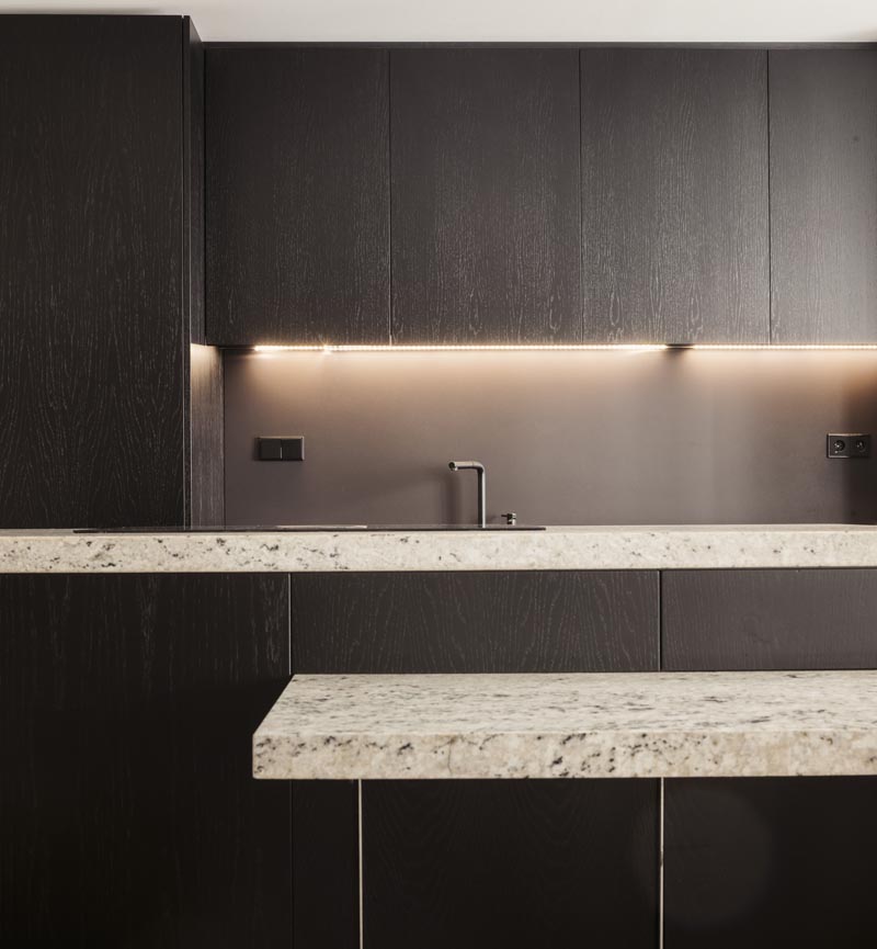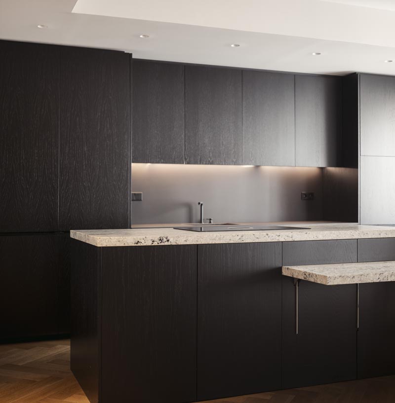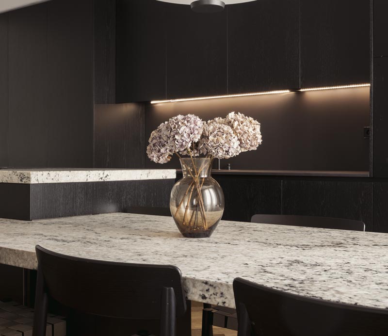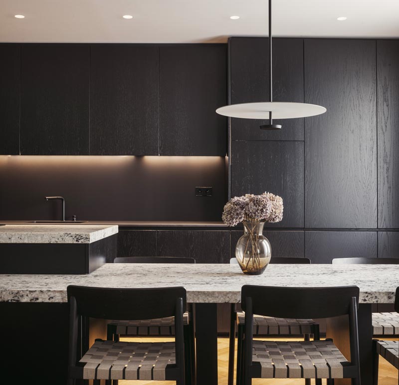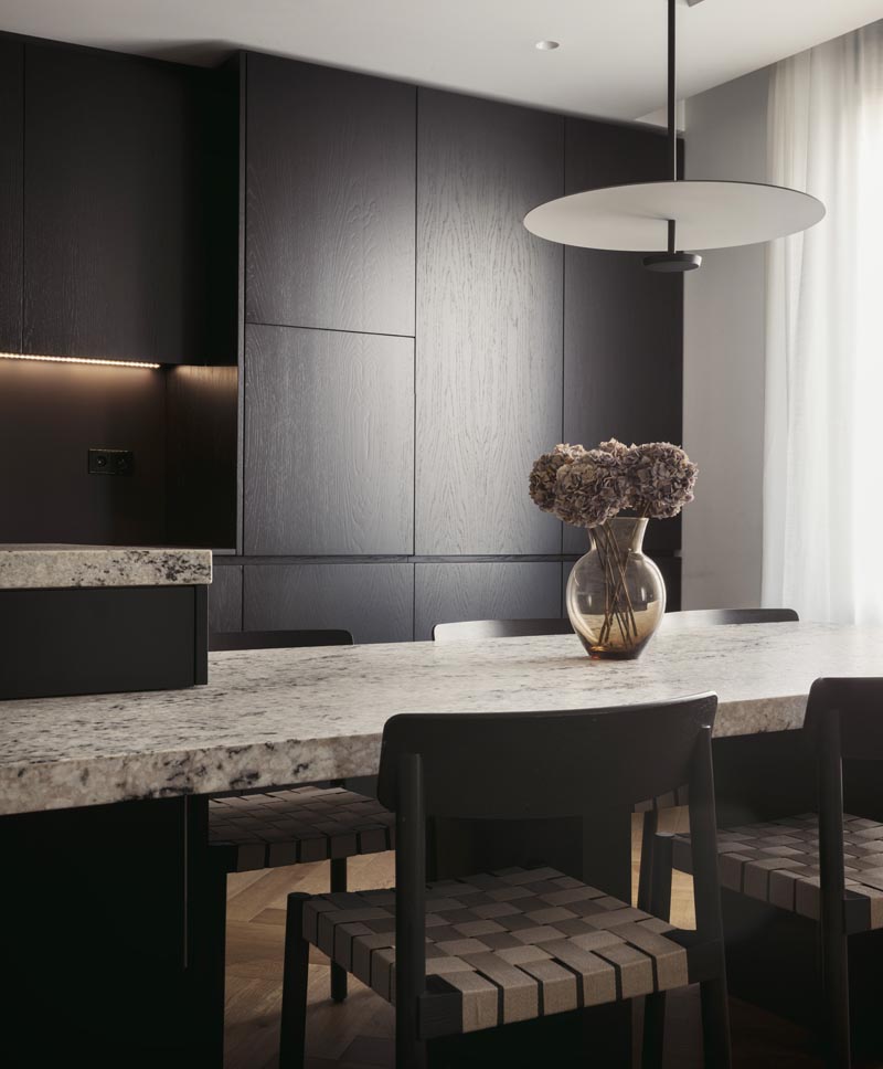 En la cocina, la madera natural cobra protagonismo. Tratada para abrir su poro y lacada en negro, contrasta con las bancadas: una en Dekton, de líneas modernas, y otra en granito natural, con un canto recrecido que aporta robustez y elegancia. El juego de alturas en las bancadas enfatiza la funcionalidad, separando la zona de trabajo de la mesa integrada.