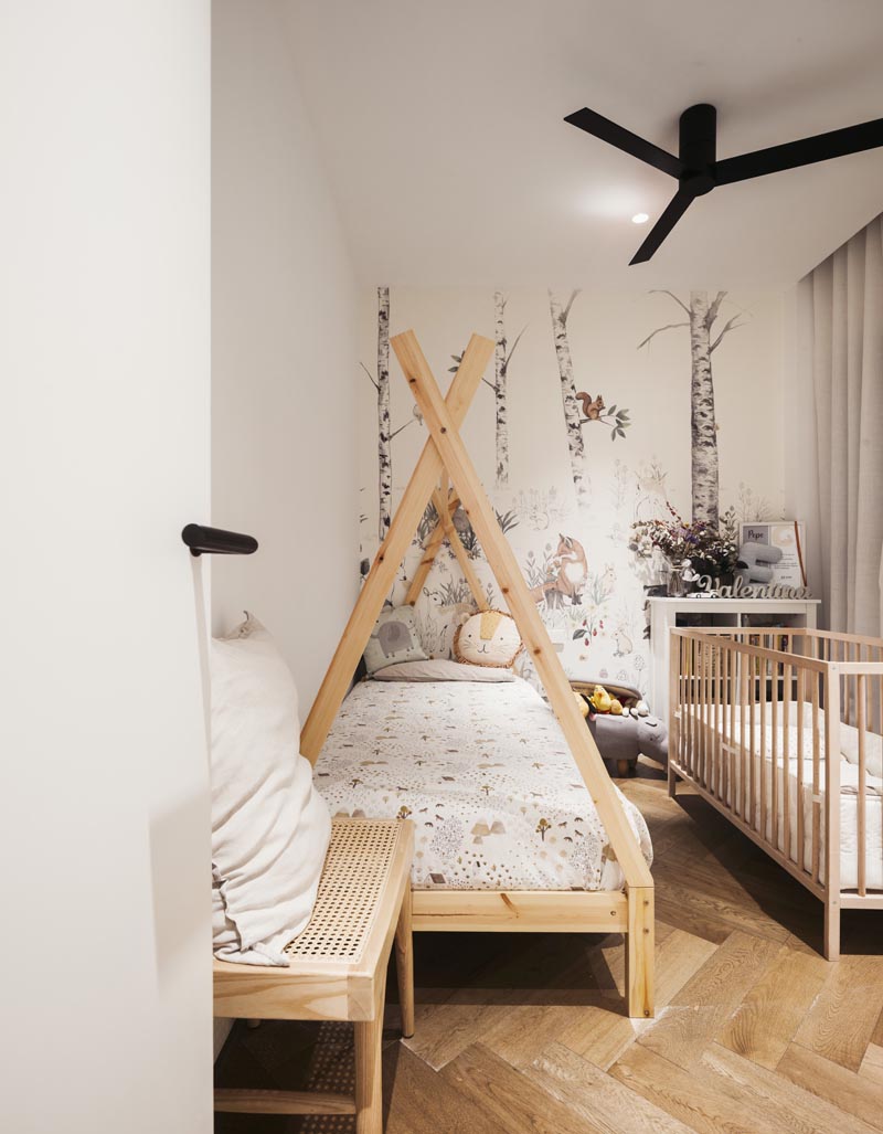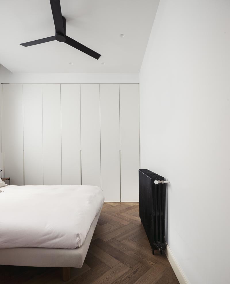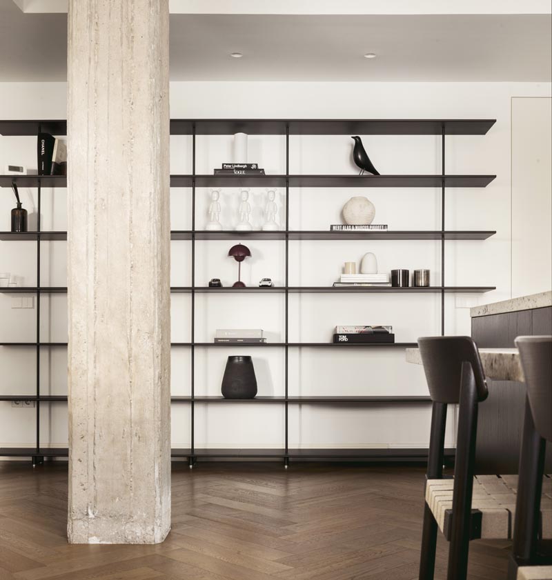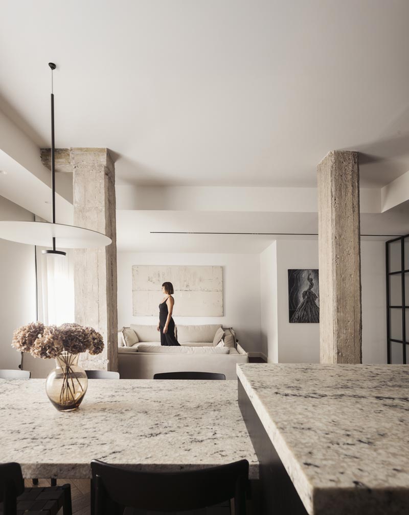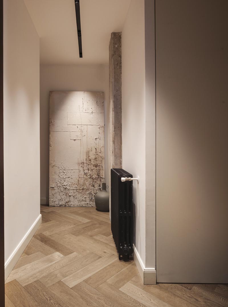 El suelo, dispuesto en espiga, crea un recorrido fluido que conecta con los pilares originales de la vivienda, cuidadosamente restaurados y mantenidos a la vista. Estos pilares, con sus imperfecciones y manchas únicas, se erigen como elementos que anclan la memoria de la casa en su contexto histórico.