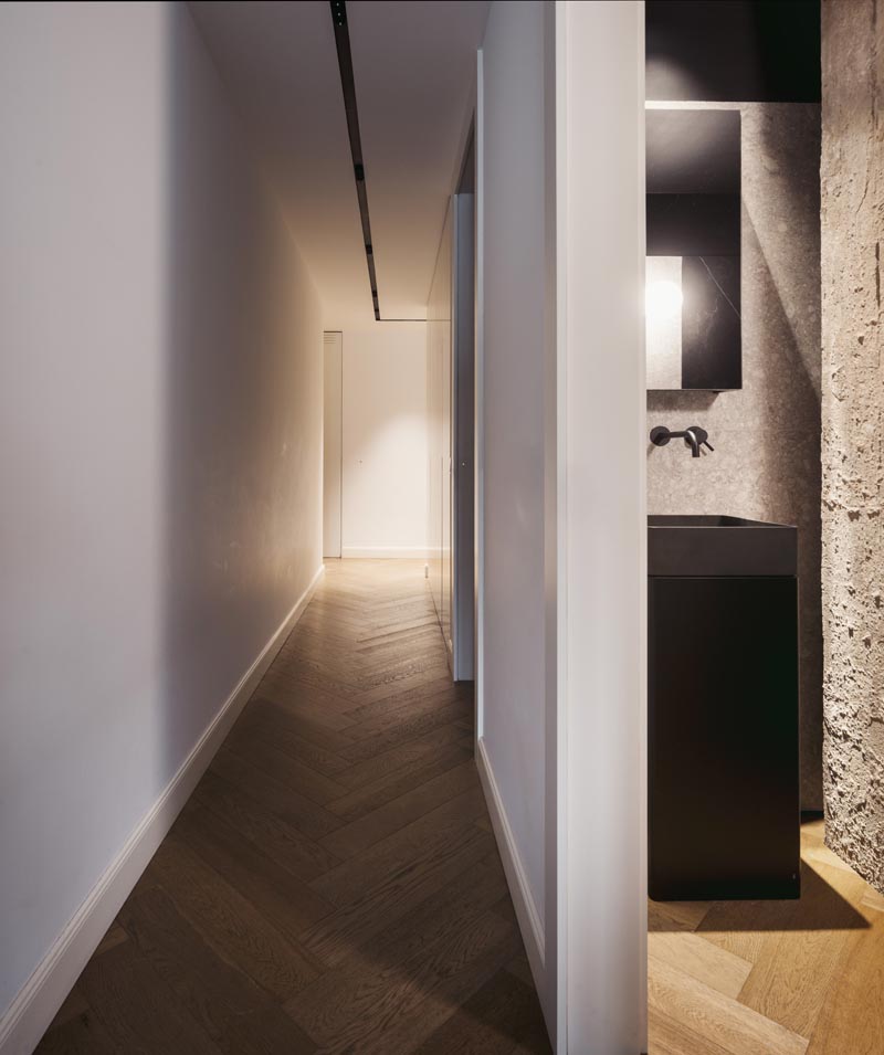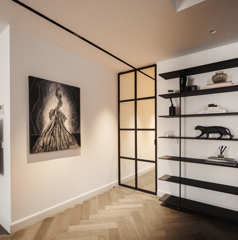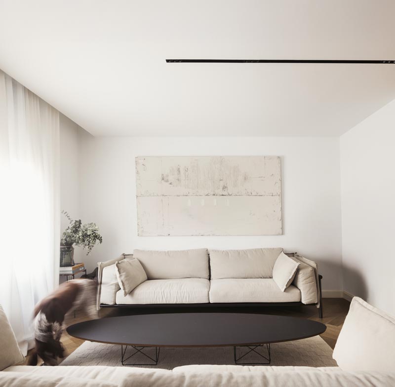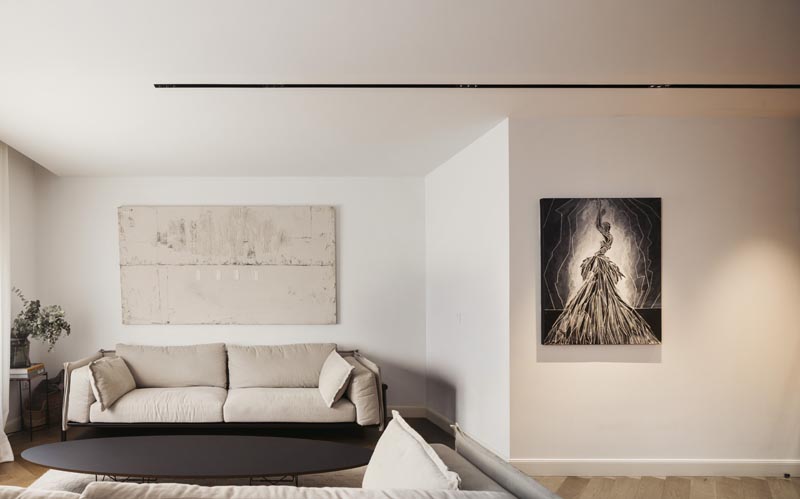 La iluminación, cuidadosamente integrada en el falso techo, guía el tránsito por los espacios mediante rieles que unen pasillo, recibidor y comedor, mientras que focos estratégicos enfatizan los volúmenes y texturas de cada estancia.