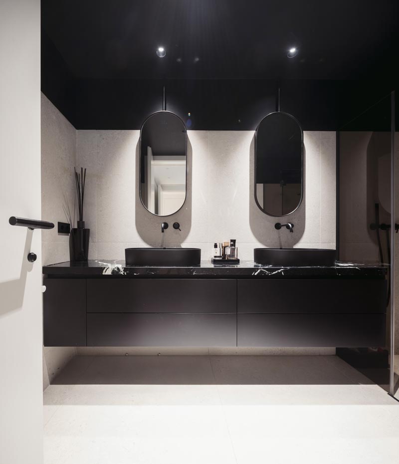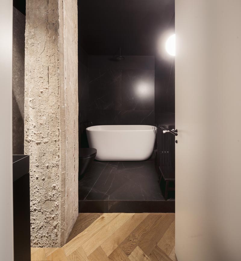 En los baños, cada detalle cuenta, en uno de ellos incluye un escalón, convertido en elemento decorativo al dividir diferentes colores, una zona negra con bañera y otra con paredes que imitan piedra, reforzando la dualidad del diseño. El segundo baño, concebido como un refugio cálido de inspiración spa, destaca por su piedra de mármol verde.
