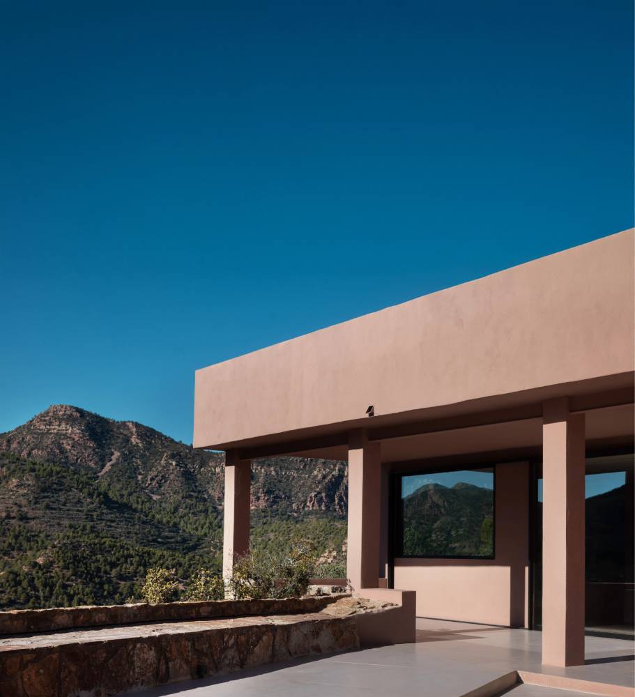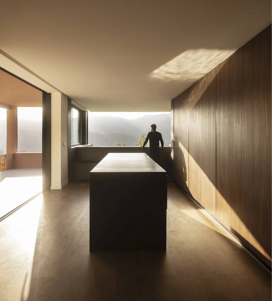 La casa se distribuye como un recorrido sereno. Las líneas son sobrias, la materialidad es honesta y la arquitectura busca desaparecer para permitir que el paisaje irrumpa en cada estancia. El uso de madera, la piedra y hormigón trabajado con precisión crea una estética contemporánea que dialoga con la rusticidad del entorno sin estridencias.